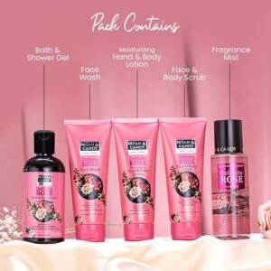 - Complete Face & Body care kit with bath and shower gel, face wash, face scrub, Hand & Body lotion, and Rose fragrance mist.